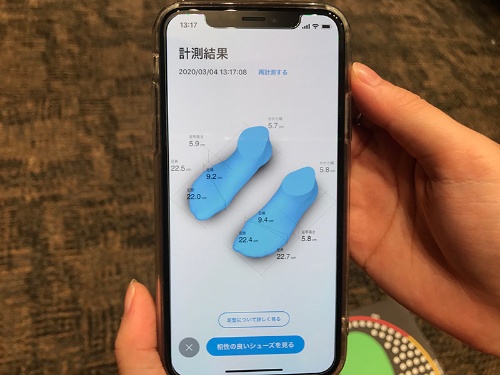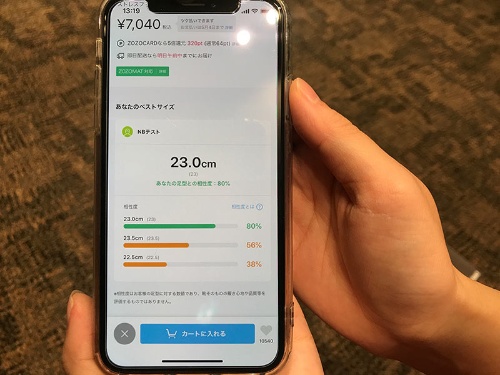 ゾゾマットの使い方については、昨年発表時から変化はない。マットの中央に足を置き、スマートフォンのゾゾタウンアプリを立ち上げて周囲をぐるりと撮影すると、くるぶしまでの足全体の3次元形状を計測できる。ZOZOはこの形状を元に、機械学習などを用いて最適な商品やサイズをアプリやウェブサイト上で推奨する。例えば足長が25センチメートルの人でも、推奨商品のサイズは24.5センチメートル表示であったり、26センチメートル表示であったりするケースがある。現時点の対応商品は100種類程度だが、今後拡大していくという。