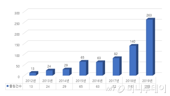 중소기업 출원은 2017년 누계 기준 15건에 불과했지만 2018년 20건, 2019년 50건으로 최근 2년 동안 출원량이 급격히 증가하고 있다.
