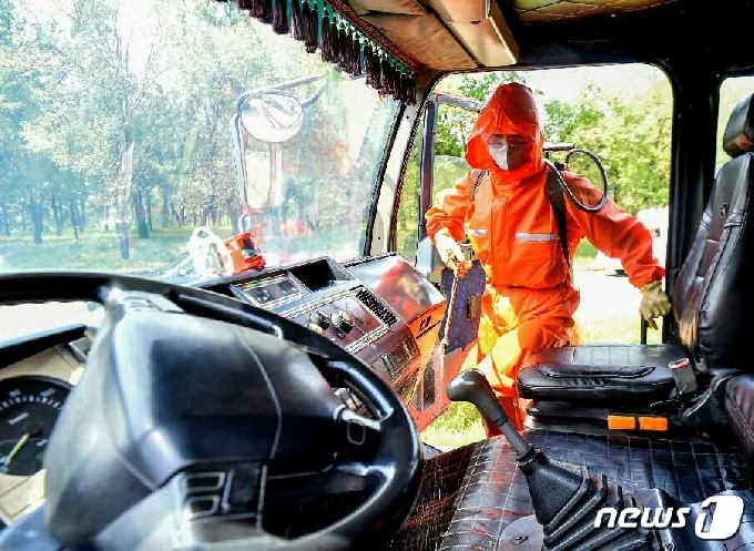 (평양 노동신문=뉴스1) = 북한 노동당 기관지 노동신문은 20일 신종 코로나바이러스 감염증(코로나19) 방역을 중심으로 한 9·10월 위생 월간사업을 조명했다. 신문은 "각지에서 9·10월 위생 월간사업을 힘있게 벌여나가고 있다"라며 "생산환경, 생활환경을 인신하고 거리와 마을을 위생 문화적으로 더 잘 꾸려 악성 전염병을 철저히 막아야 한다"라고 전했다. 사진은 운전 기재를 소독하고 있는 평양 낙랑구역 노동자의 모습.