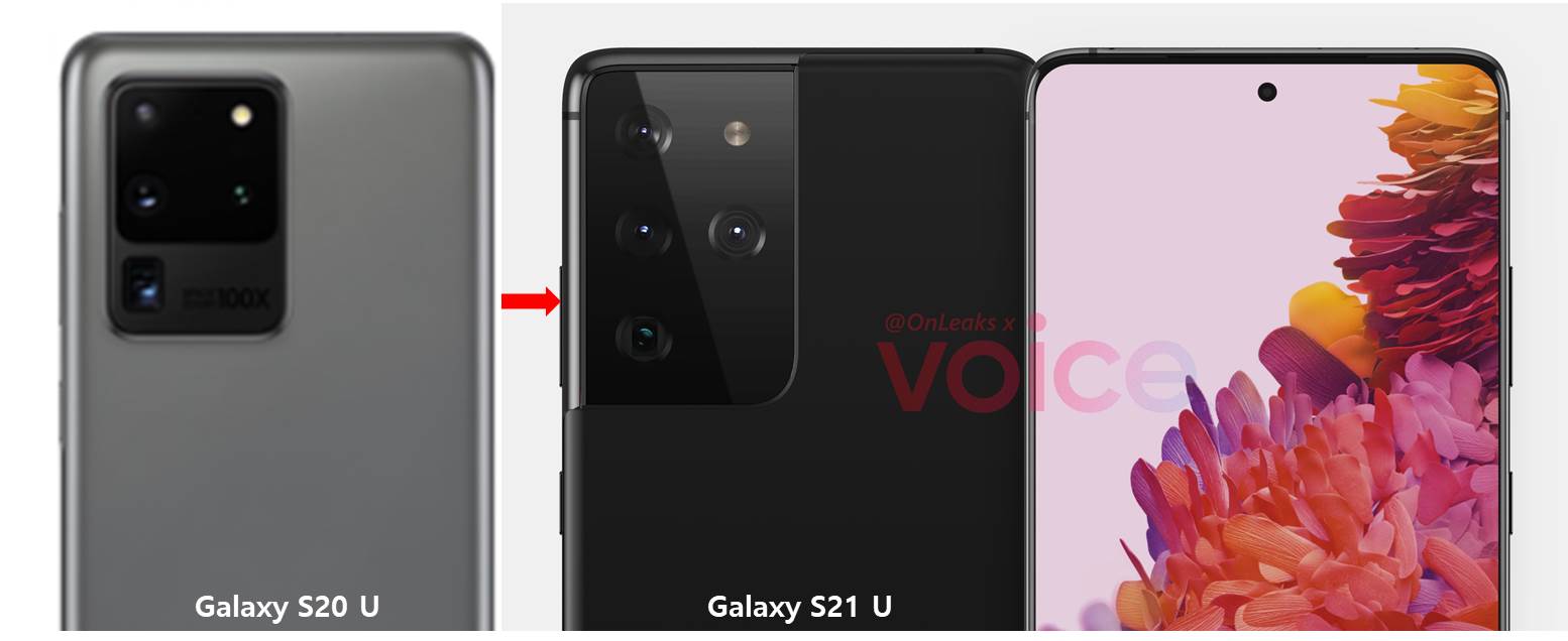 렌더링을 보면 후면 카메라의 배열이 달라질 것으로 보인다. S20 울트라의 경우 스페이스줌 카메라가 별도로 하단에 위치하는 데 반해 S21 울트라는 4개의 카메라가 하나의 모듈에 장착된다. 전면 디자인은 S20과 큰 차이가 없다.
