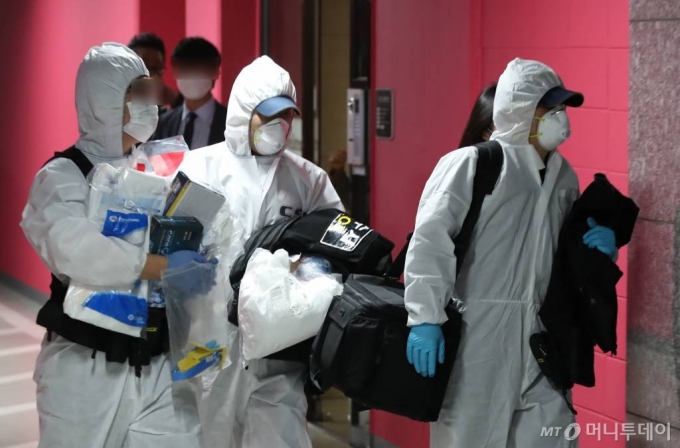 | 개그우먼 박지선 씨와 그의 모친이 자택에서 숨진 채 발견된 2일 자택이 있는 아파트 지하주차장에서 과학수사대 관계자들이 분주한 모습을 보이고 있다./사진=뉴시스 |