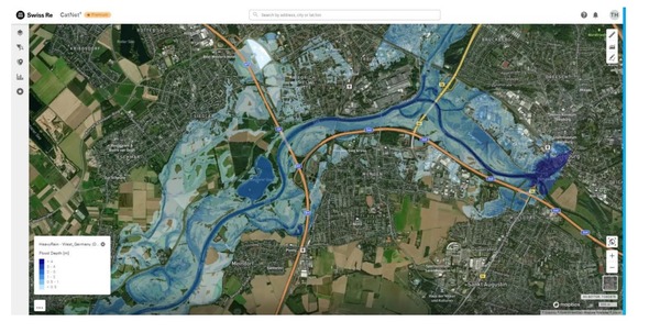 実証実験はスイス再保険が独自開発したジオ・リスクプラットフォームに人工衛星による高解像度浸水フットプリントを搭載し、被災地域の浸水深を算出する。これによって得られた浸水深データとドライブレコーダーなど、通信車載器から取得した車両の最終停車位置情報を掛け合わせることで、車両の浸水深を把握する。