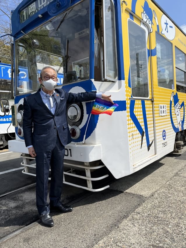 猫の駅長で知られる和歌山電鉄(和歌山市)は、ロシアの侵攻で被害が広がるウクライナに平和が戻ることを願い、15日から運行車両にウクライナ国旗と虹色の「平和の旗」をヘッドマークとして取り付ける。同社が属する両備グループ(岡山市)内の親会社、岡山電気軌道(岡山市)は12日から路面電車に両旗を掲示している。また日本への避難民支援で、両備グループとして1億円を寄付する。